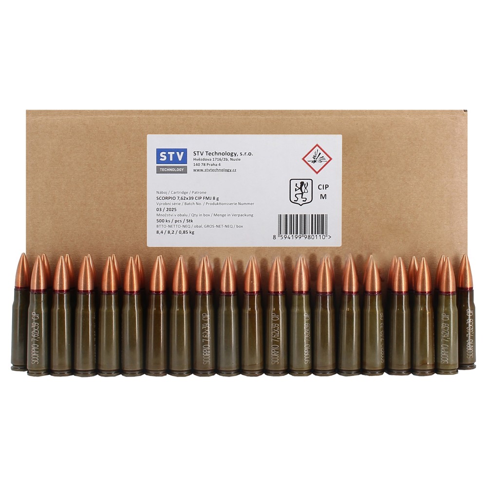 ogive FMJ de 124 grains, montée sur une douille en acier cuivré à percussion centrale