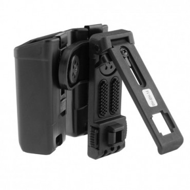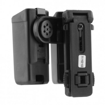 L´étui pivotant double est constitué des deux étuis mh-xx (pour chargeur) réunis sur un adaptateur spécial. L´avantage de cette solution est que cela permet de gagner de la place sur le ceinturon.Les deux étuis pivotent sur le ceinturon simultanément, alors que leur position mutuelle reste inchangée.L´adaptateur rend facilement possible le port du côté droit ou gauche.Le système d'accrochage rapide ubc-02 permet son installation sur le ceinturon sans avoir à le dégrafer.L'écart entre le matériel transporté est beaucoup moins important avec ce système de clip.L'étui peut pivoter autour de la ceinture de 360 degrés avec 16 positions d'arrêt.Compatible avec le système molle.Couleur: noir